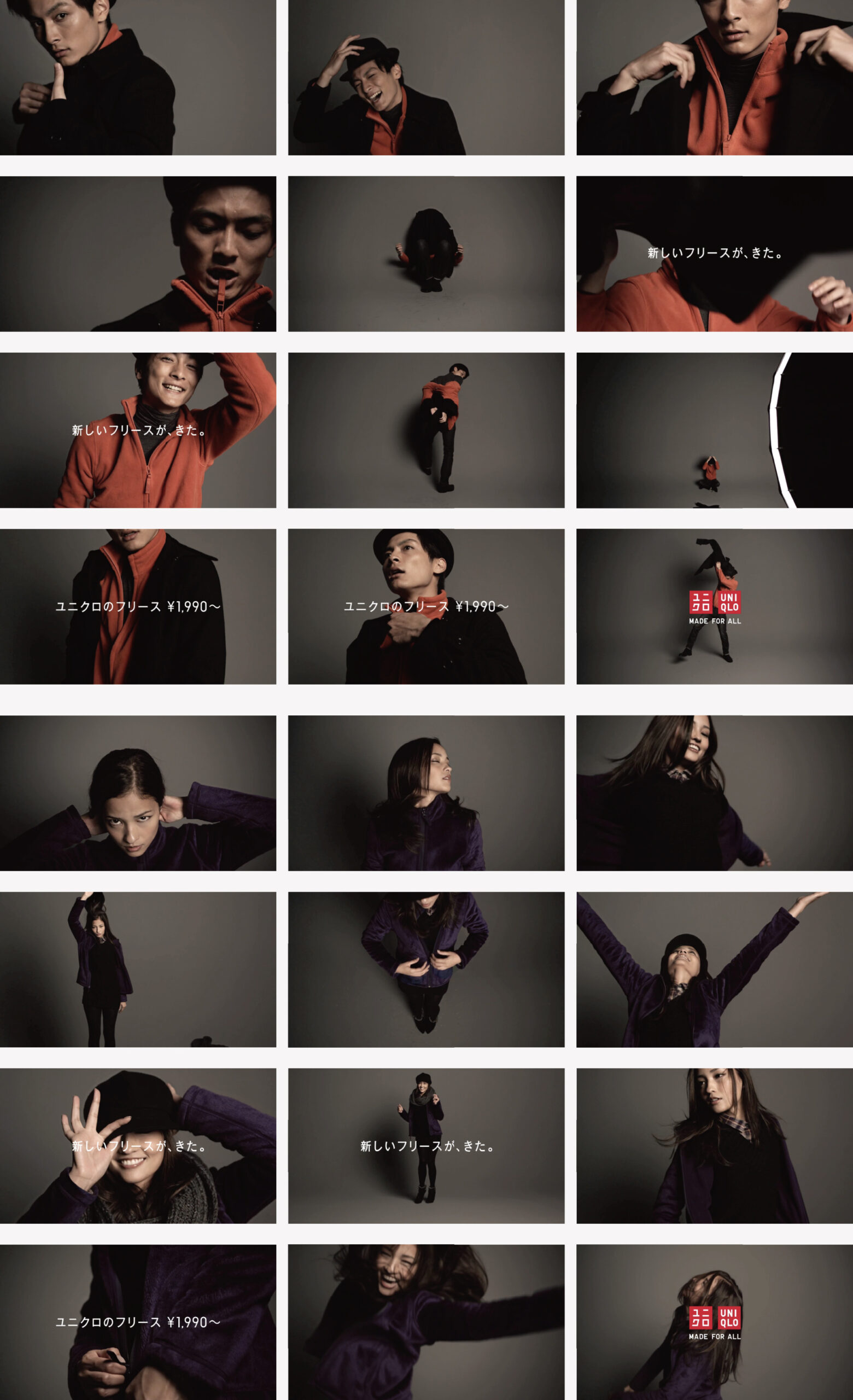 TVCM Client : UNIQLO CO., LTD. Executive Creative Director : Koichi Sawada (dentsu) Creative Director : Takuya Isozima (dentsu) Art Director : Takahisa Nakajima Film Director : Koichi Iguchi Copywriter : Takuya Isozima (dentsu) Cameraman : Takaki Kumada Producer : Takaharu Hatori (TYO monster) Producer : Kentaro Kinoshita (TYO monster) Music : Keisuke Tominaga