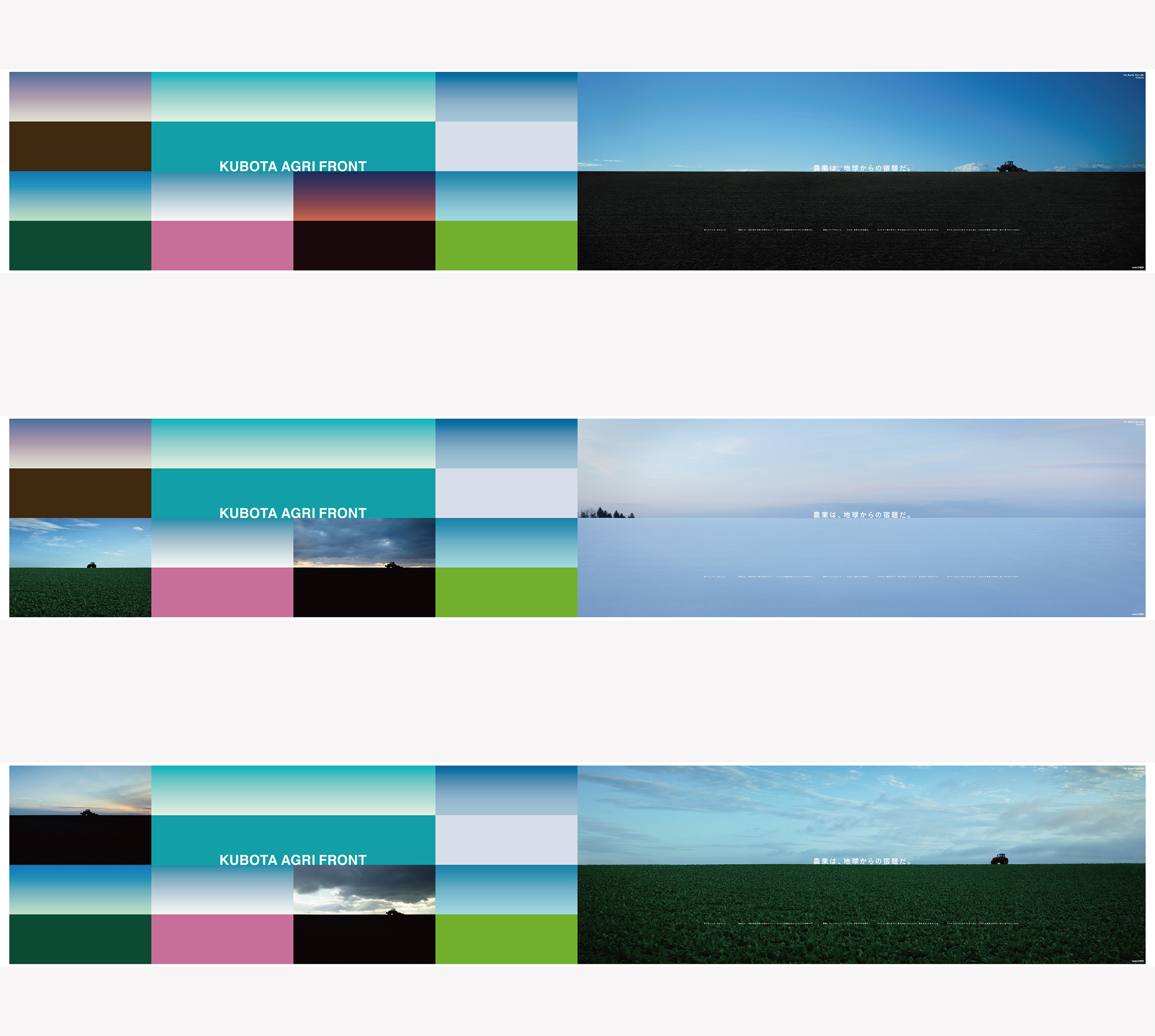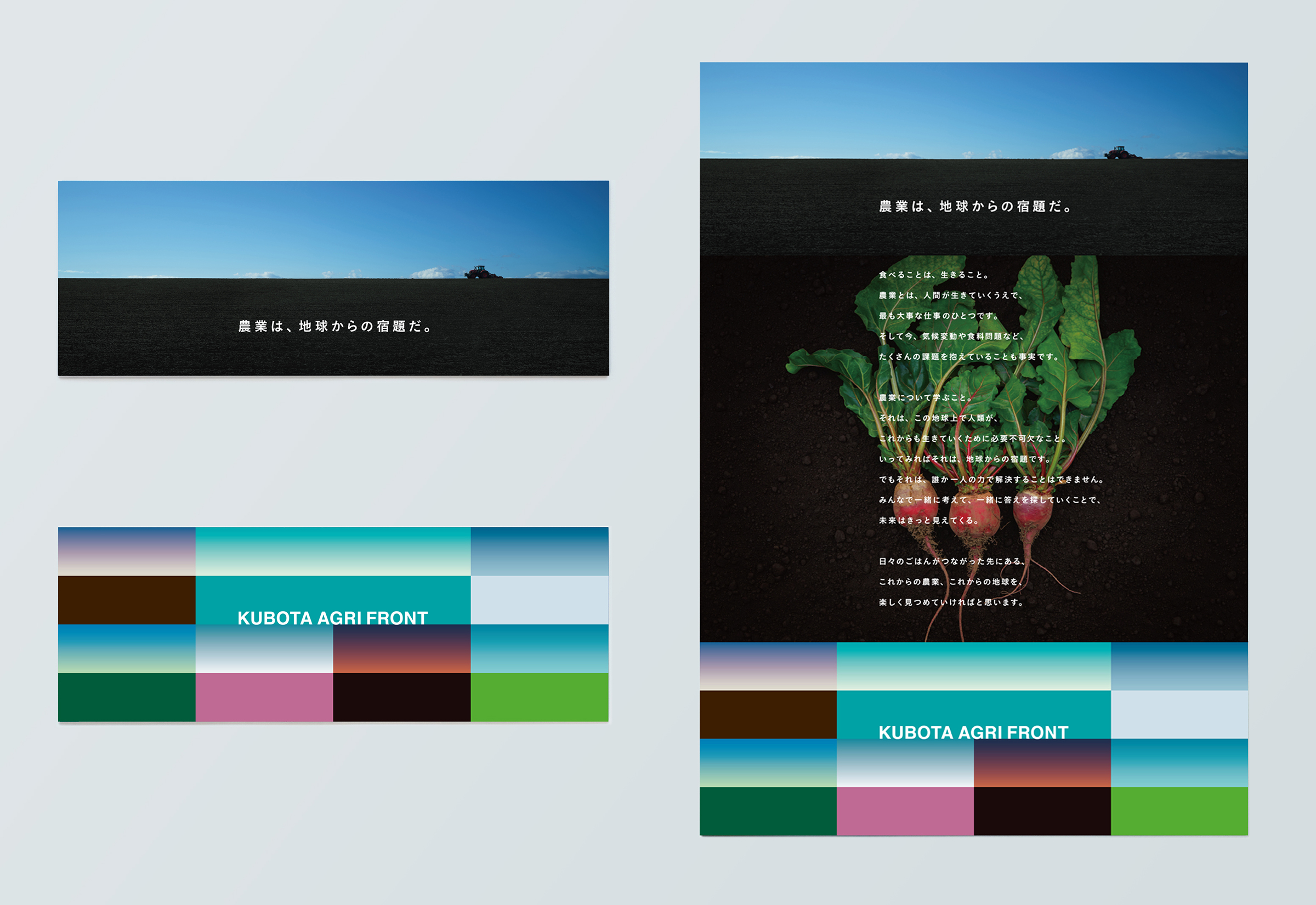 VI & GRAPHICS / MOVIE Client : Kubota Corporation Creative Director : Takahisa Nakajima Art Director : Takahisa Nakajima Designer : Ryota Sugahara Copywriter : Kana Koyama (uedake) Photographer : Takaya Sakano Film Director : Kosuke Ishige (ROBOT) https://www.youtube.com/watch?v=U9tfM1tuwI8
